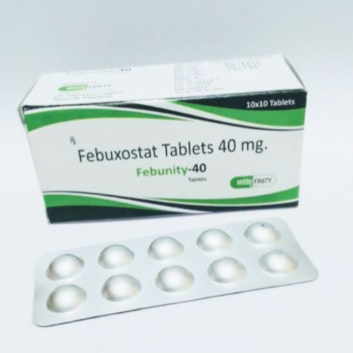 FEBUNITY-40 Tablets contain Febuxostat 40 mg, a xanthine oxidase inhibitor used for the long-term management of hyperuricemia associated with gout. Febuxostat works by reducing the production of uric acid in the body, thereby helping prevent the formation of urate crystals that cause joint pain, inflammation, and gout attacks.